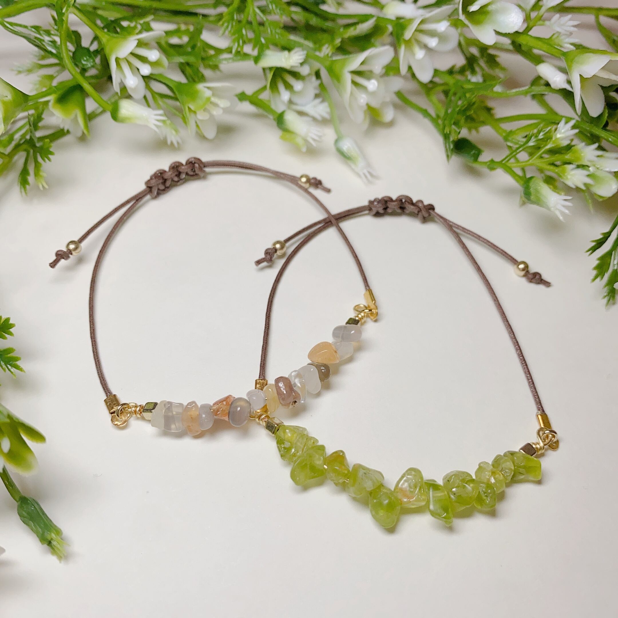 水や汗・アルコール等によって、石の色合いの変化や紐の劣化につながる恐れがあります。