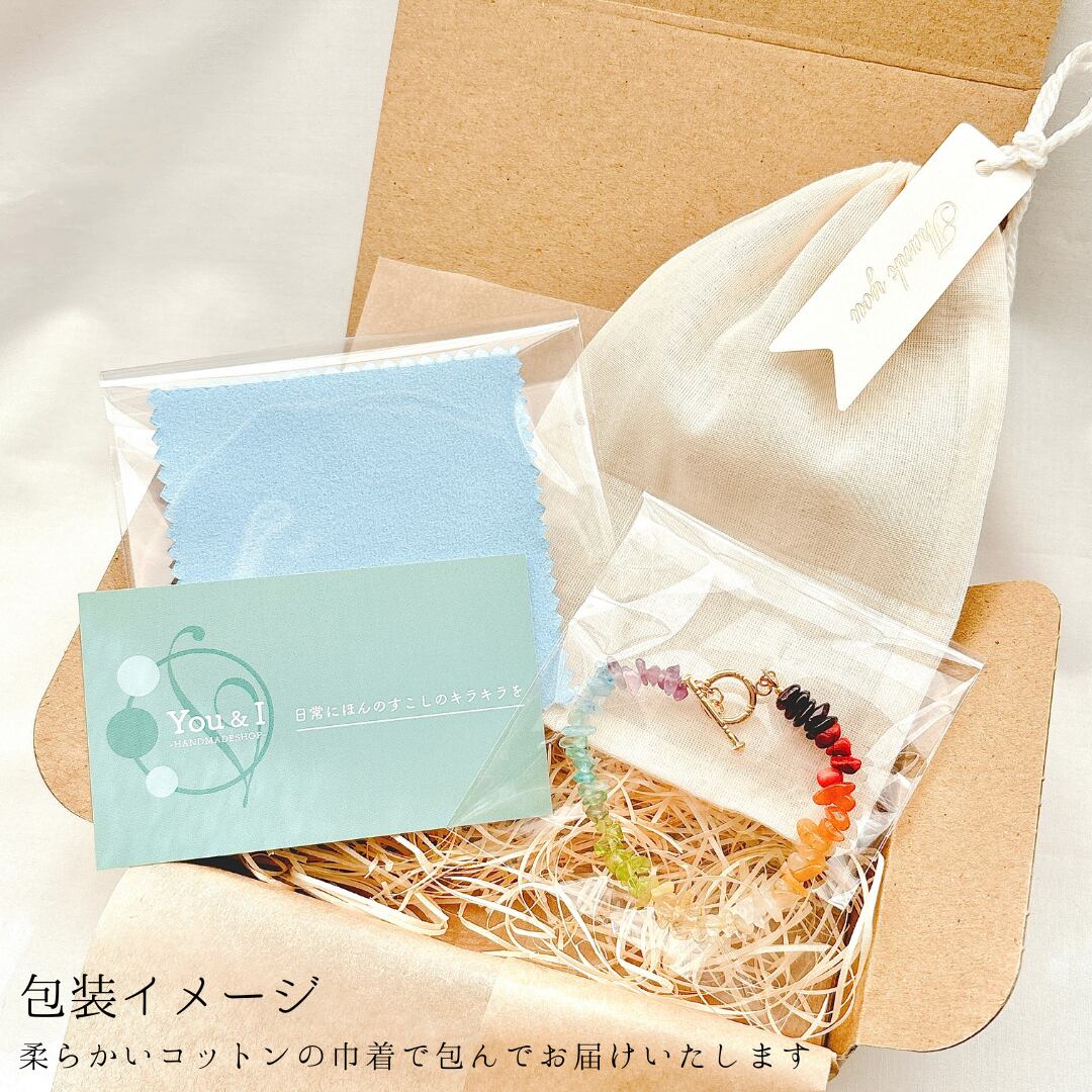 小粒の天然石と小さな葉っぱモチーフをチャームにしました。
